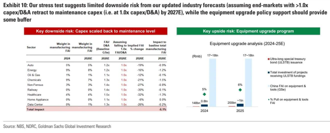 从终端市场看,仅消费电子(折叠屏手机)、电池(固态技术)、AIDC 等少数领域会有资本支出扩张,多数制造业的产能利用率和产量不足以支撑资本支出上行。不过压力测试(见下图)显示,2026 年资本支出强度(资本支出 / 折旧)下行风险有限,且工业设备升级政策将提供缓冲。
