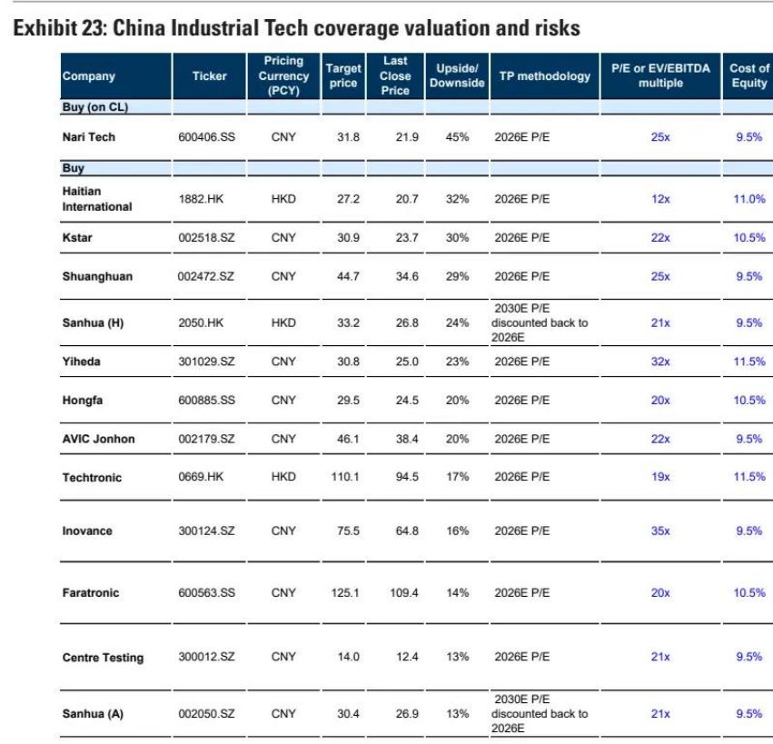 Estun(下调至卖出):2025年股价反弹16%(跑赢行业和沪深300),但人形机器人研发仍处早期,且38%收入依赖光伏 / 汽车等需求疲软领域(FA 同行平均仅14%)。2025-30年EPS下调30%-42%,目标价隐含 57% 下行空间。