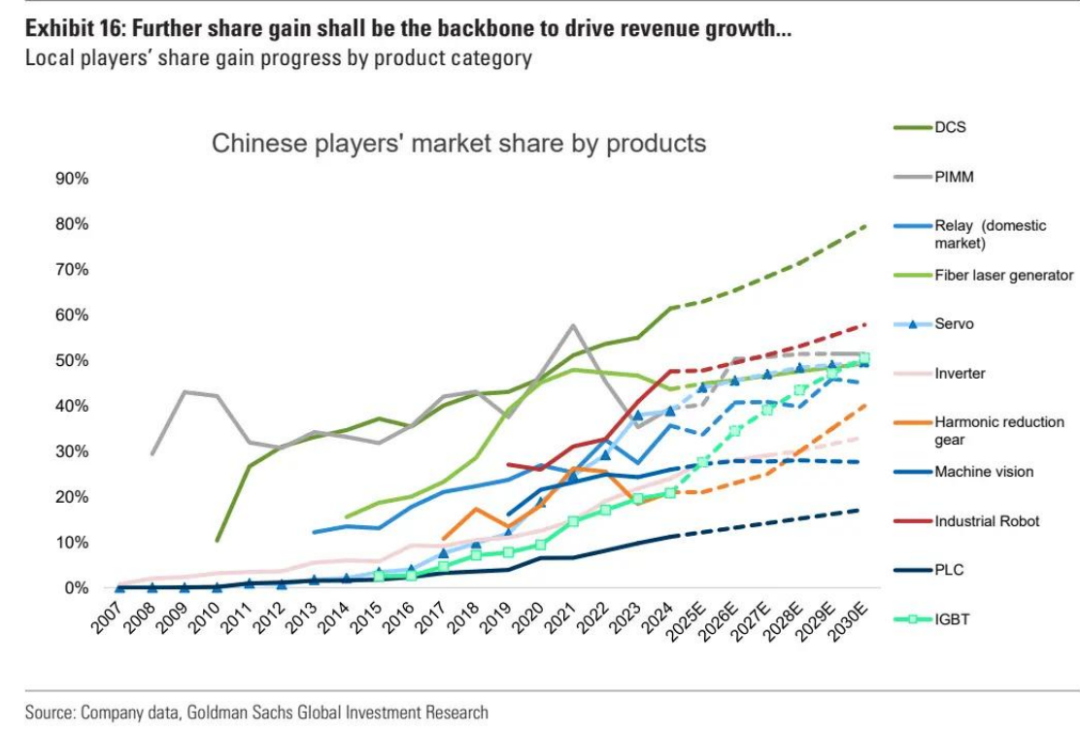 核心增长动力:缺乏终端市场红利时,进一步提升市场份额和拓展海外业务是收入增长的关键。从数据看,本土企业在 DCS、伺服、工业机器人等多个产品品类的份额持续提升(见图 16)。