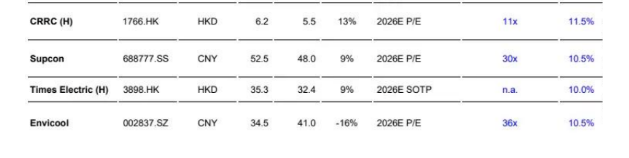 中国中车-H(01766)(上调至买入):2026 年预期股息率 4.7%,高于 1 年期美债收益率(4.11%),是高吸引力的收益标的。尽管铁路主业增长缓慢,但 2025-2030 年整体营收 / 净利润预计年复合增长 5%,新兴产业(如售后零部件)年复合增长 8%。