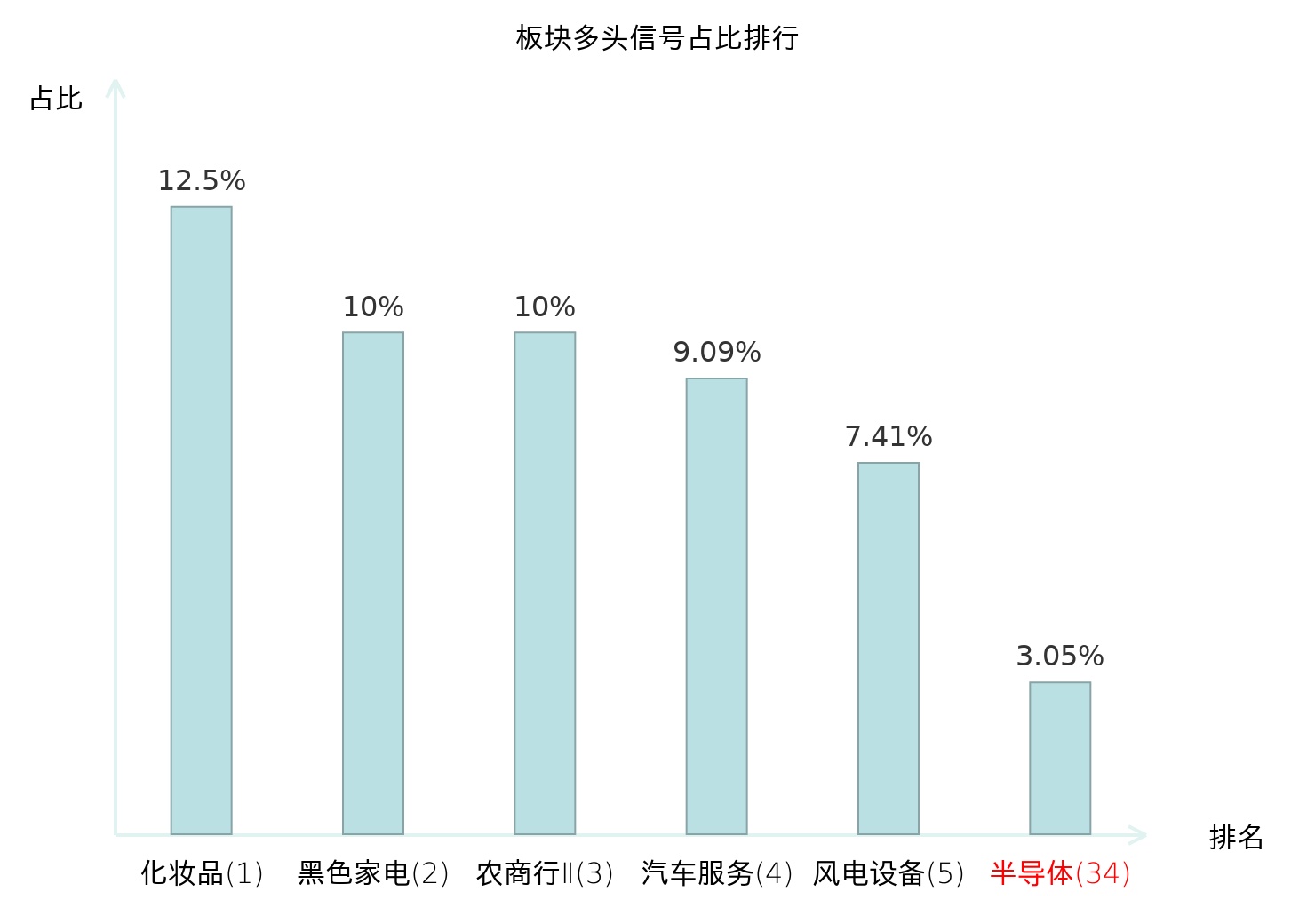 全市场所有行业板块中主力多头信号占比排名中,化妆品板块位居第一。黑色家电板块名次提升最快,较昨日上升111位。