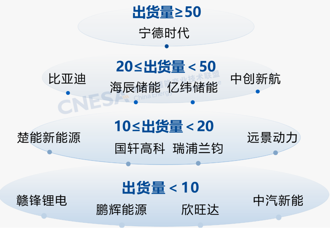 根据CNESA DataLink全球储能数据库的不完全统计,2025年上半年,中国企业储能电池(不含基站、数据中心电芯)全球市场出货量达233.6GWh。若按照出货量≥50GWh、20GWh≤出货量<50GWh、10GWh≤出货量<20GWh、出货量<10GWh四个梯度划分入围企业,宁德时代仍稳居榜首并独属第一梯队,二梯队企业正加速缩小与其的差距。