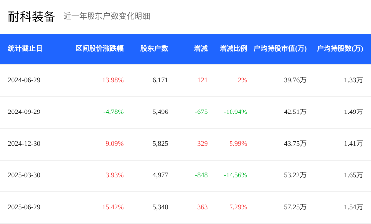 与行业数据对比,耐科装备所属的半导体行业在2025年6月30日的平均股东数和平均户均持股市值暂无具体数据。但可以推测,如果耐科装备的股东户数和户均持股市值变化趋势与行业整体趋势一致,那么这可能反映了整个行业的市场情绪和资金流向。如果耐科装备的表现与行业整体趋势不同,则可能表明公司具有独特的市场地位或基本面优势。