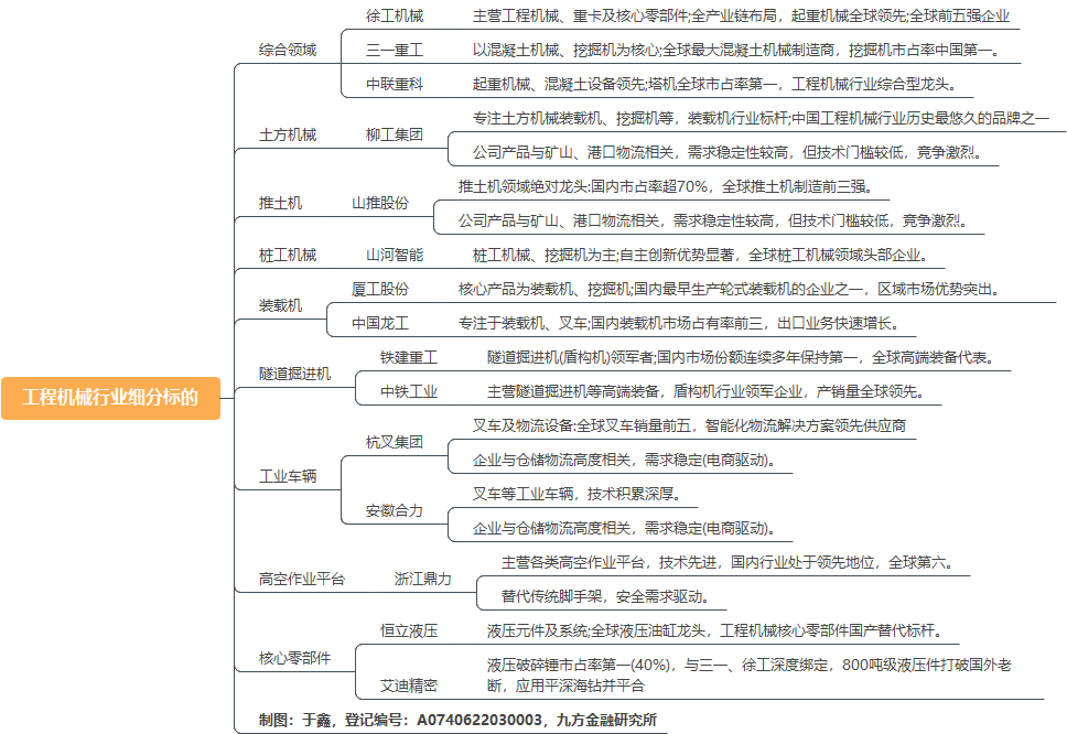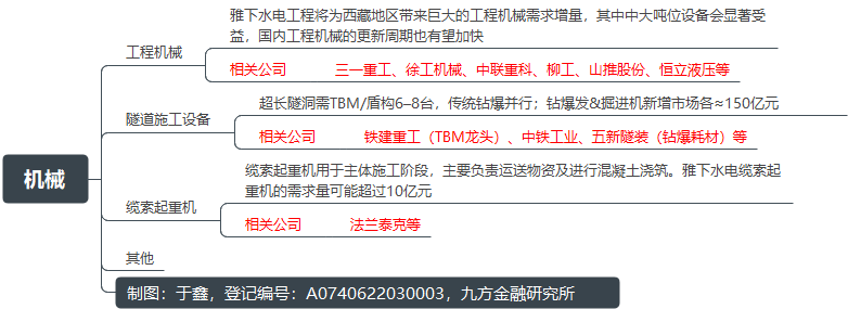 龙头上市公司包括整机龙头三一重工、中联重科、徐工机械、柳工、山推股份等,零部件龙头恒立液压,雅下水电工程相关受益标的包括铁建重工、中铁工业、山河智能、广东宏大等。