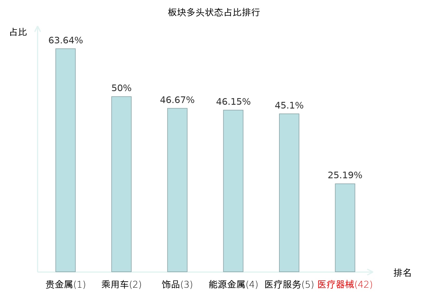 全市场所有行业板块中主力多头状态占比排名中,贵金属板块位居第一。电机Ⅱ板块名次提升最快,较昨日上升61位。