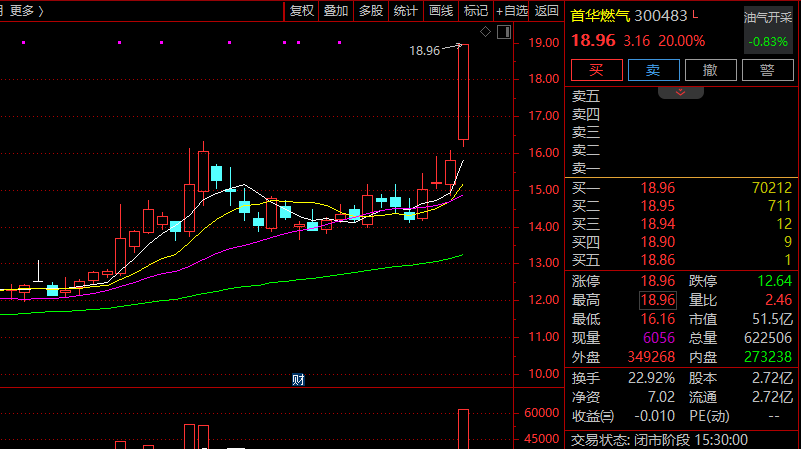 燃气板块逆势走强,首华燃气20cm涨停,长春燃气国新能源等涨停。