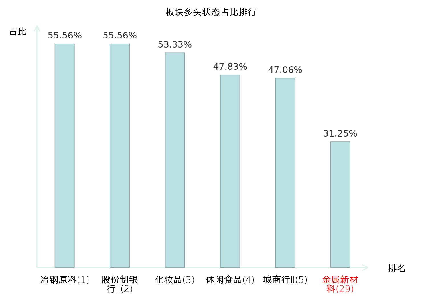 全市场所有行业板块中主力多头状态占比排名中,冶钢原料板块位居第一。其他家电Ⅱ板块名次提升最快,较昨日上升105位。
