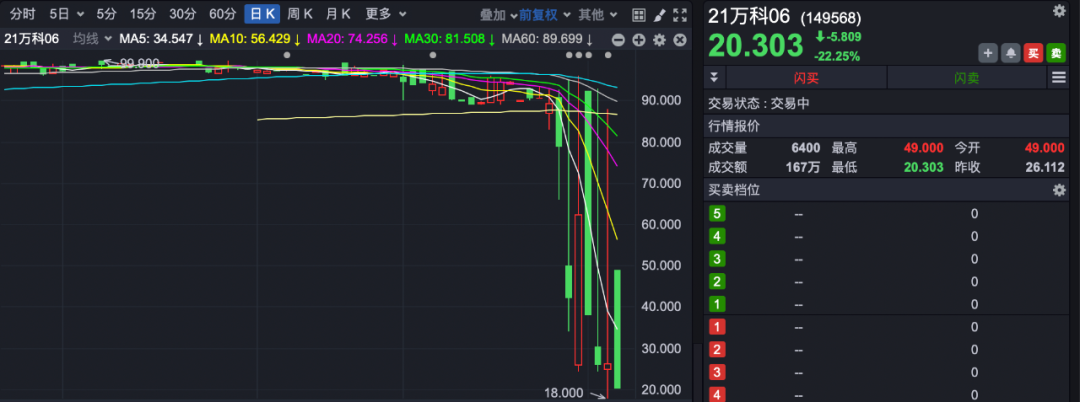 万科债券大跌。深交所公告,“21万科06”盘中成交价较前收盘价首次下跌达到或超过20%,深交所自今日09时51分04秒起对该债券实施临时停牌,于10时21分05秒复牌。