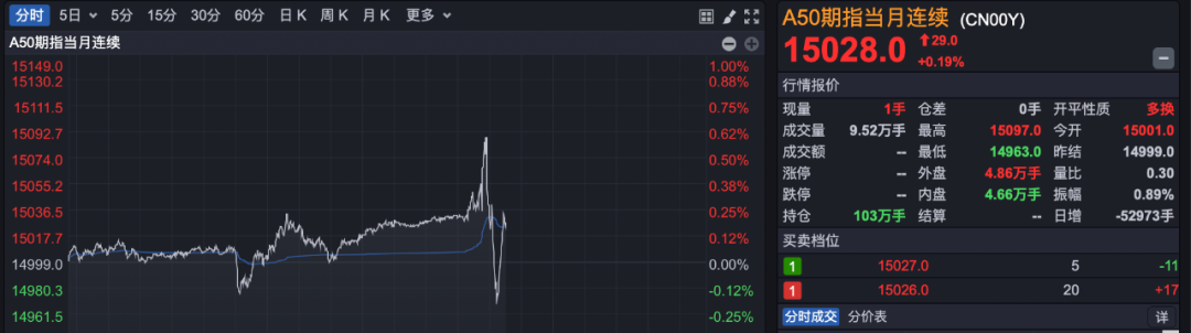 A50期指盘中突然直线跳水,一度由涨转跌,之后快速拉升,截至发稿涨幅为0.19%。