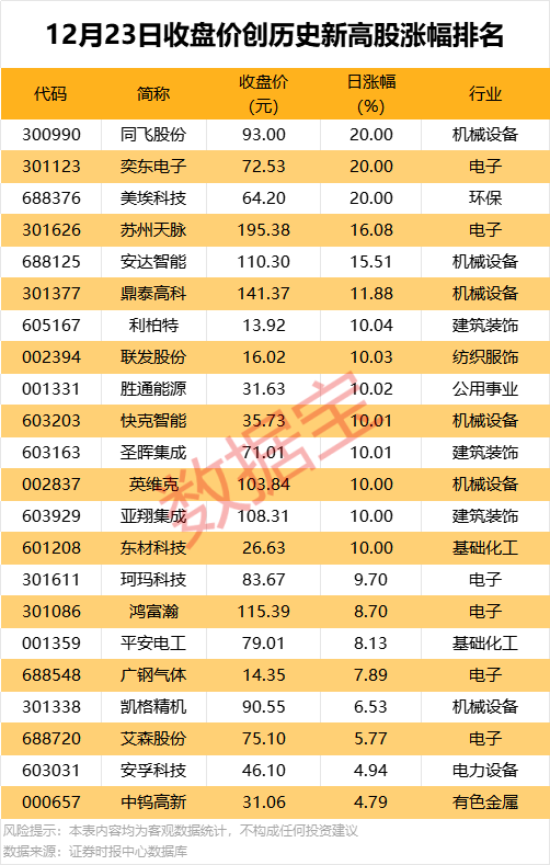 从股价表现看,收盘价创历史新高股中,今日股价平均上涨6.66%,涨停的有同飞股份、奕东电子、美埃科技等;涨幅居前的有苏州天脉、安达智能、鼎泰高科等。