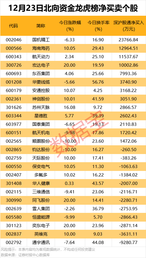 今日龙虎榜现身个股中,13股获北向资金净买入,其中国机精工获北向资金净买入超2.38亿元,居首;海南海药、航天动力、宏达电子获北向资金净买入均超1亿元。
