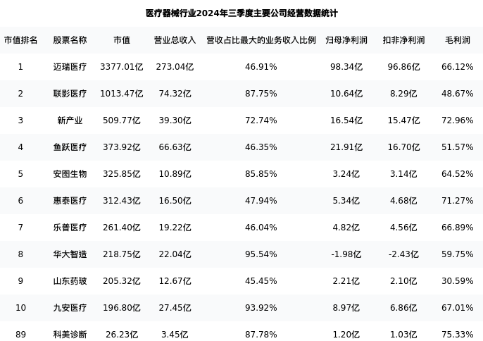 科美诊断最新报告期数据为三季度,下表汇总了医疗器械行业内市值靠前的公司三季度主要经营数据