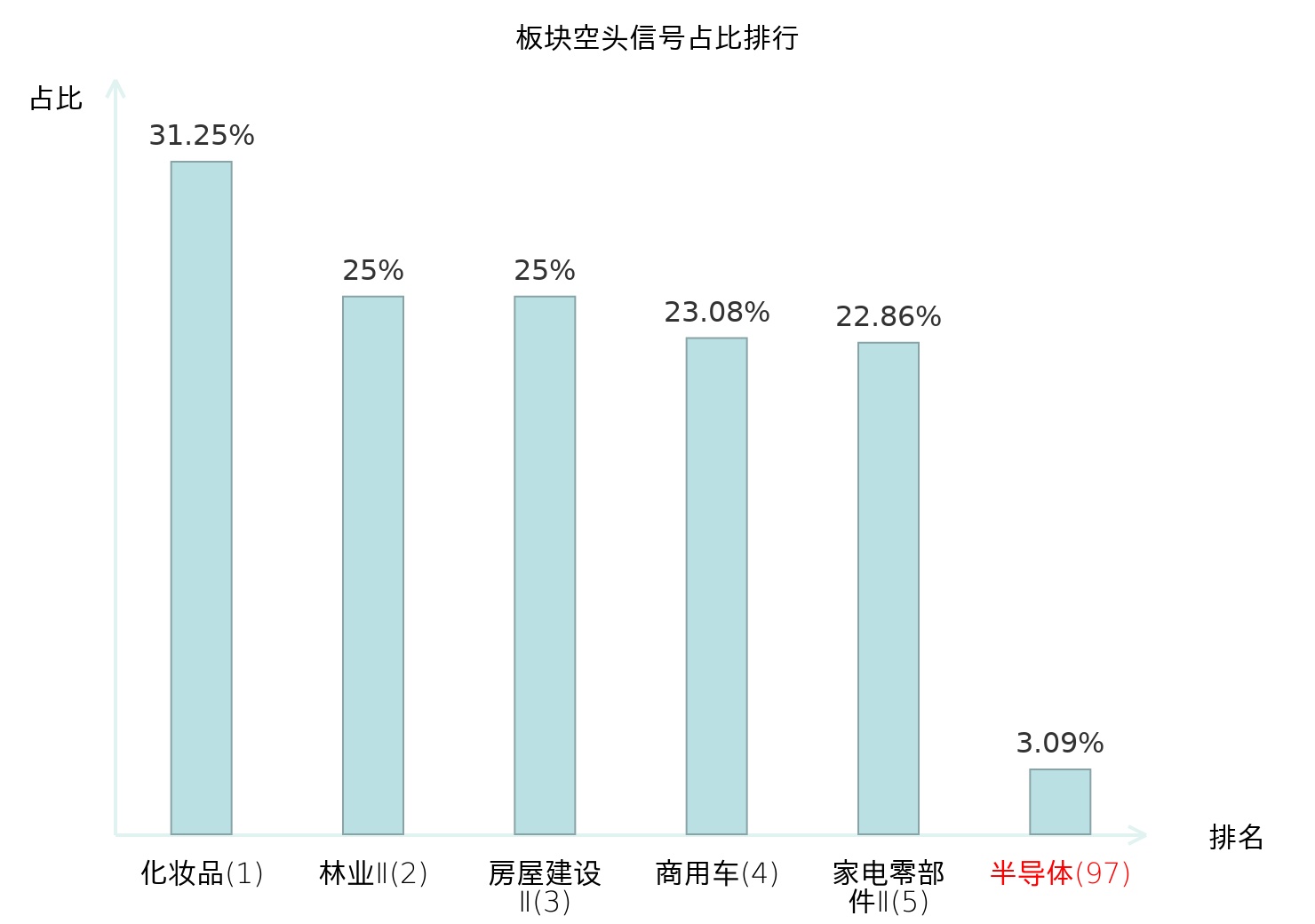 全市场所有行业板块中主力空头信号占比排名中,化妆品板块位居第一。房屋建设Ⅱ板块名次提升最快,较昨日上升113位。