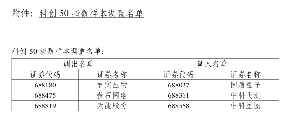 智通财经APP获悉,根据指数规则,上海证券交易所与中证指数有限公司决定调整科创50等指数样本,于2026年3月13日收市后生效。其中科创50指数更换3只样本,将君实生物(688180.SH)、萤石网络(688475.SH)、天能股份(688819.SH)调出名单;将国盾量子(688027.SH)、中科飞测(688361.SH)、中科星图(688568.SH)调入名单。