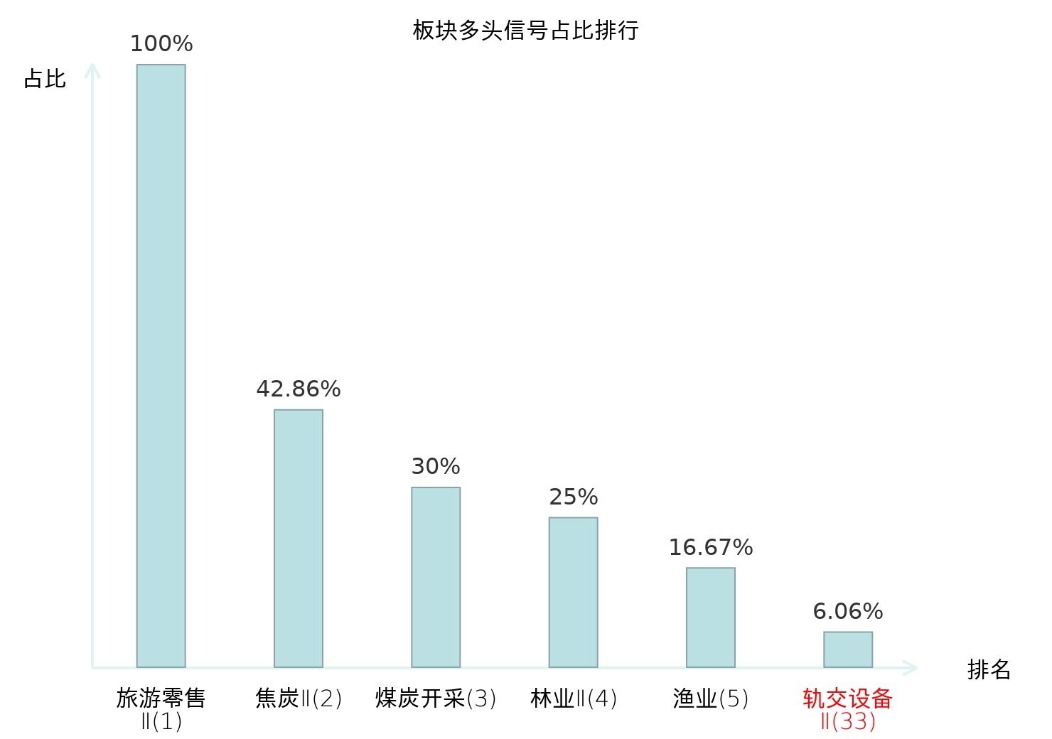 全市场所有行业板块中主力多头信号占比排名中,旅游零售Ⅱ板块位居第一。旅游零售Ⅱ板块名次提升最快,较昨日上升130位。