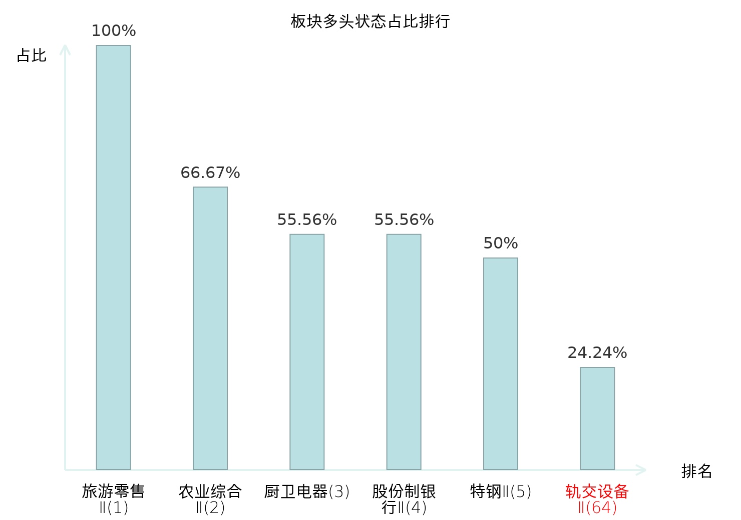 全市场所有行业板块中主力多头状态占比排名中,旅游零售Ⅱ板块位居第一。装修装饰Ⅱ板块名次提升最快,较昨日上升75位。