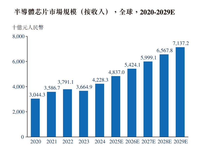 根据弗若斯特沙利文的报告,全球半导体市场规模从2020年的3.0万亿元人民币增长至2024年的4.2万亿元人民币,并预计在未来数年内继续保持强劲增长,到2029年有望达到7.1万亿元人民币的规模。