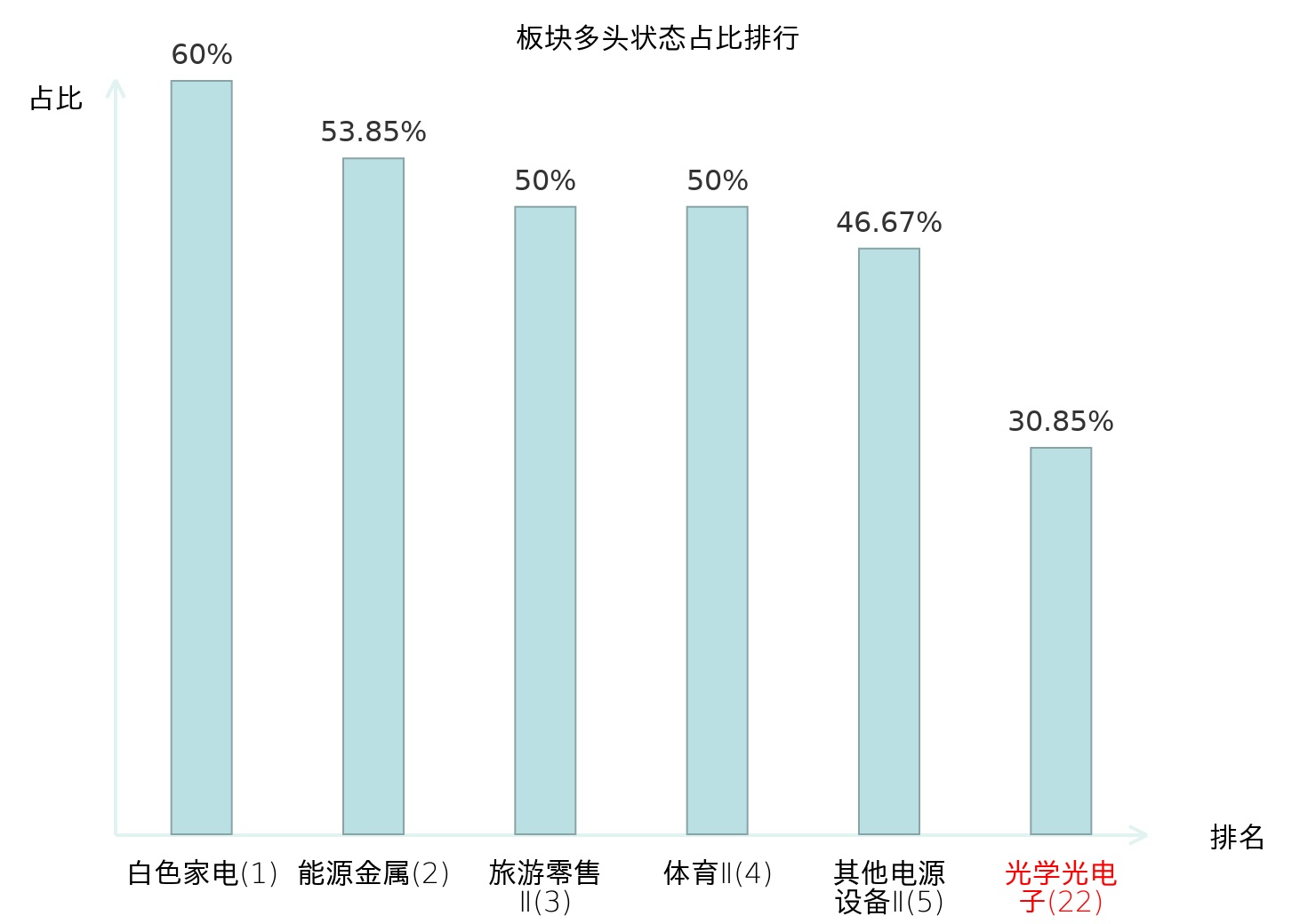 全市场所有行业板块中主力多头状态占比排名中,白色家电板块位居第一。体育Ⅱ板块名次提升最快,较昨日上升127位。