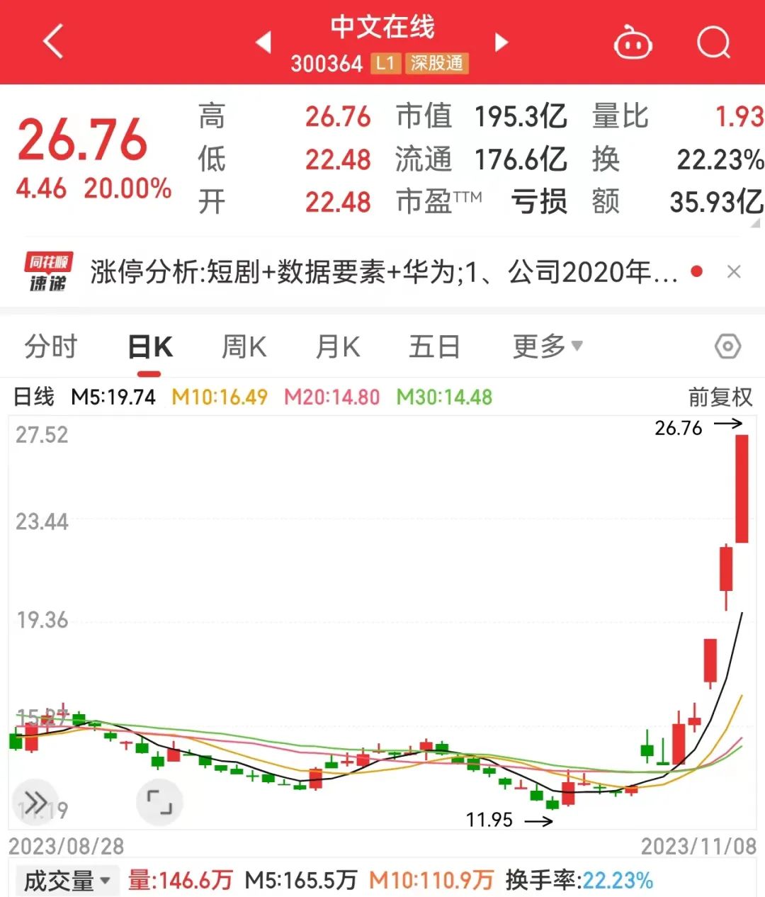 中文在线是短剧概念的绝对龙头,该股10月30日收盘价不足13元,今天上午20cm涨停后收盘26.76元,7天时间股价翻倍。本周中文在线在周一及今天早盘录得2个20cm涨停,另外周二则大涨超19%。