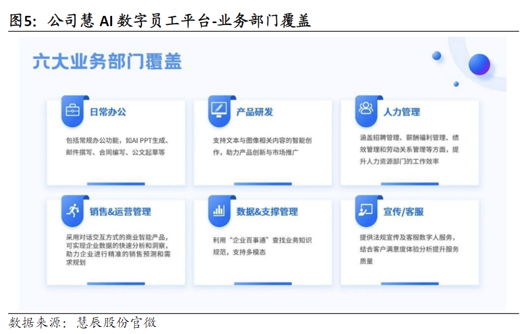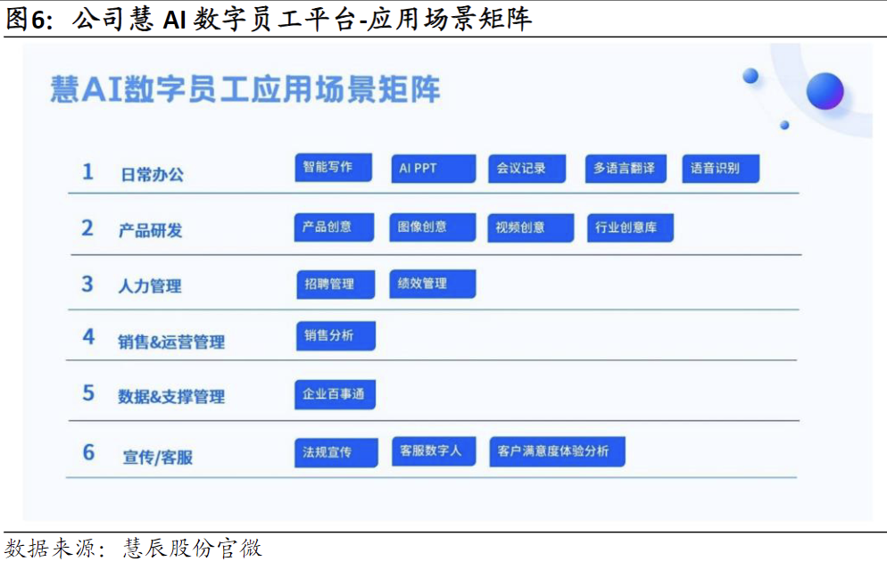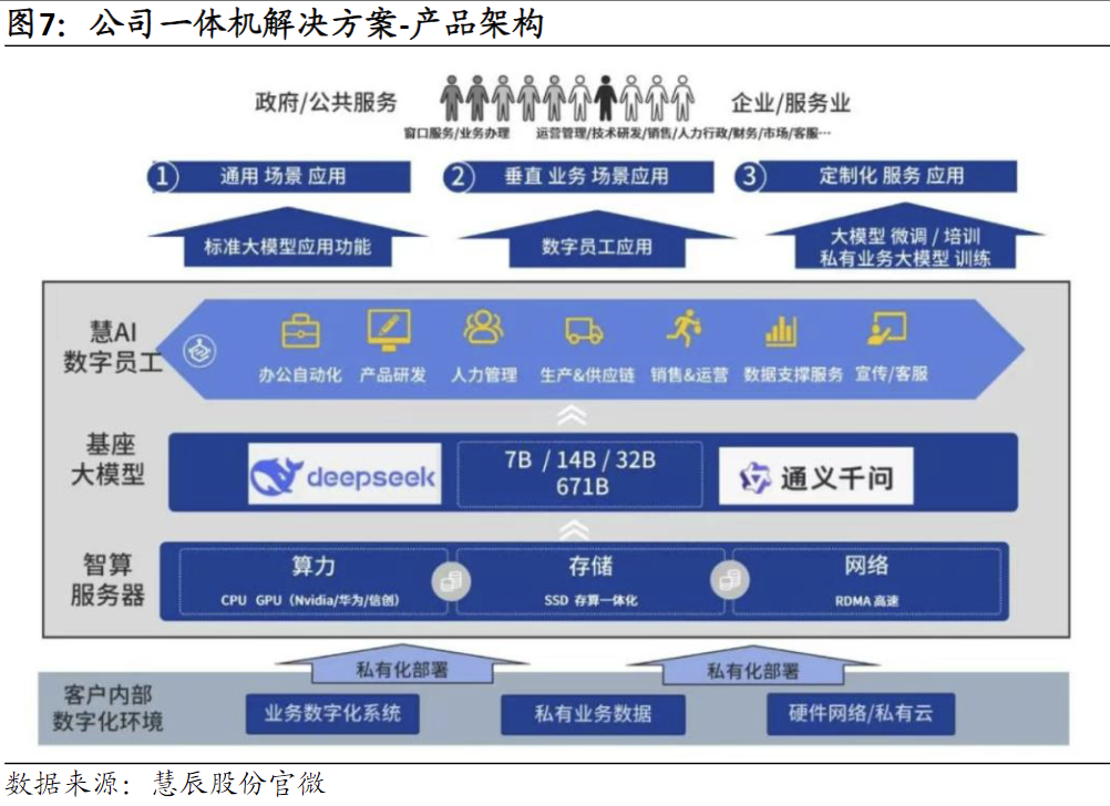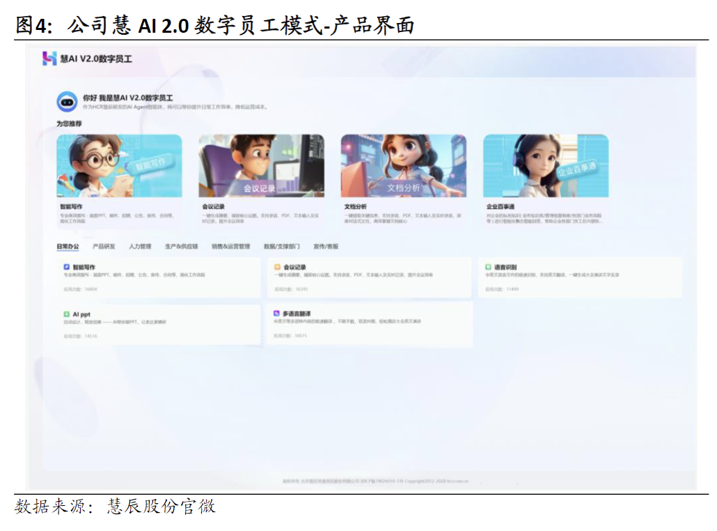积极发力AI,打造第二增长极。AI软件:公司的智能数据分析产品服务向AIGCAgent应用模式进行升级,已研发出面向企业AIGC应用场景的Agent应用平台—“慧AI智能应用平台”;AI软硬件融合:公司联合行业智算硬件合作方,基于DeepSeek大模型与慧AI数字员工产品,构建数字员工一体机解决方案;算力业务:与中科信控、棱镜数聚达成战略合作,联合研发“融合算力管理服务平台”,此外算力硬件服务方面公司也已经开始为客户交付算力资源。