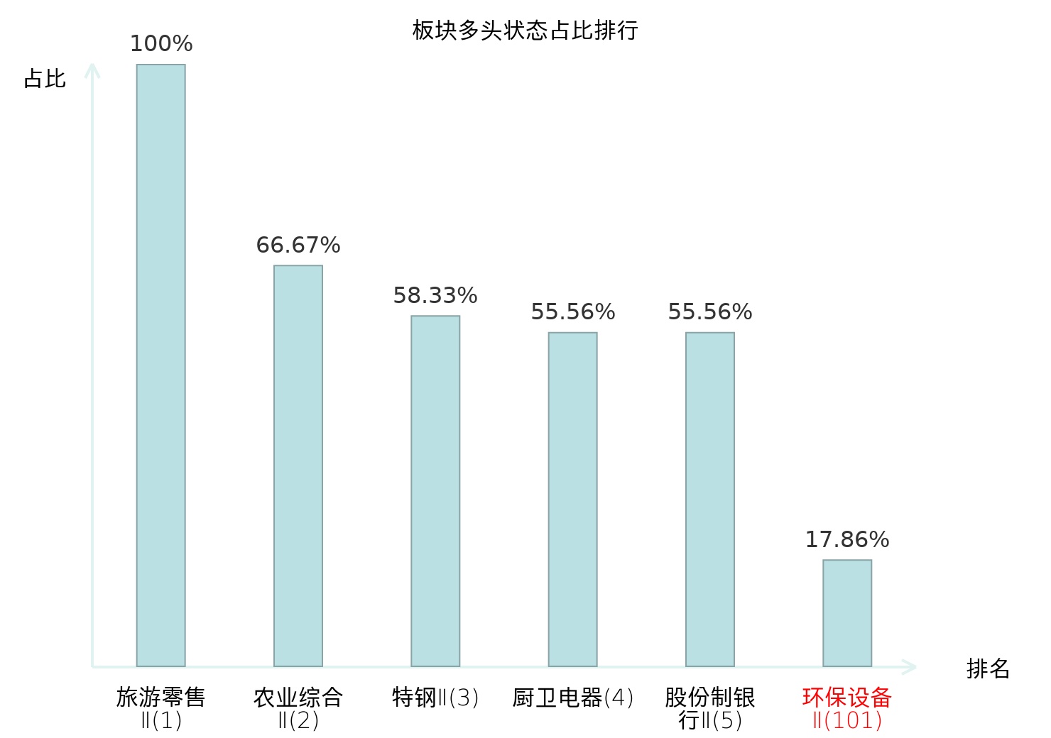 全市场所有行业板块中主力多头状态占比排名中,旅游零售Ⅱ板块位居第一。农业综合Ⅱ板块名次提升最快,较昨日上升127位。