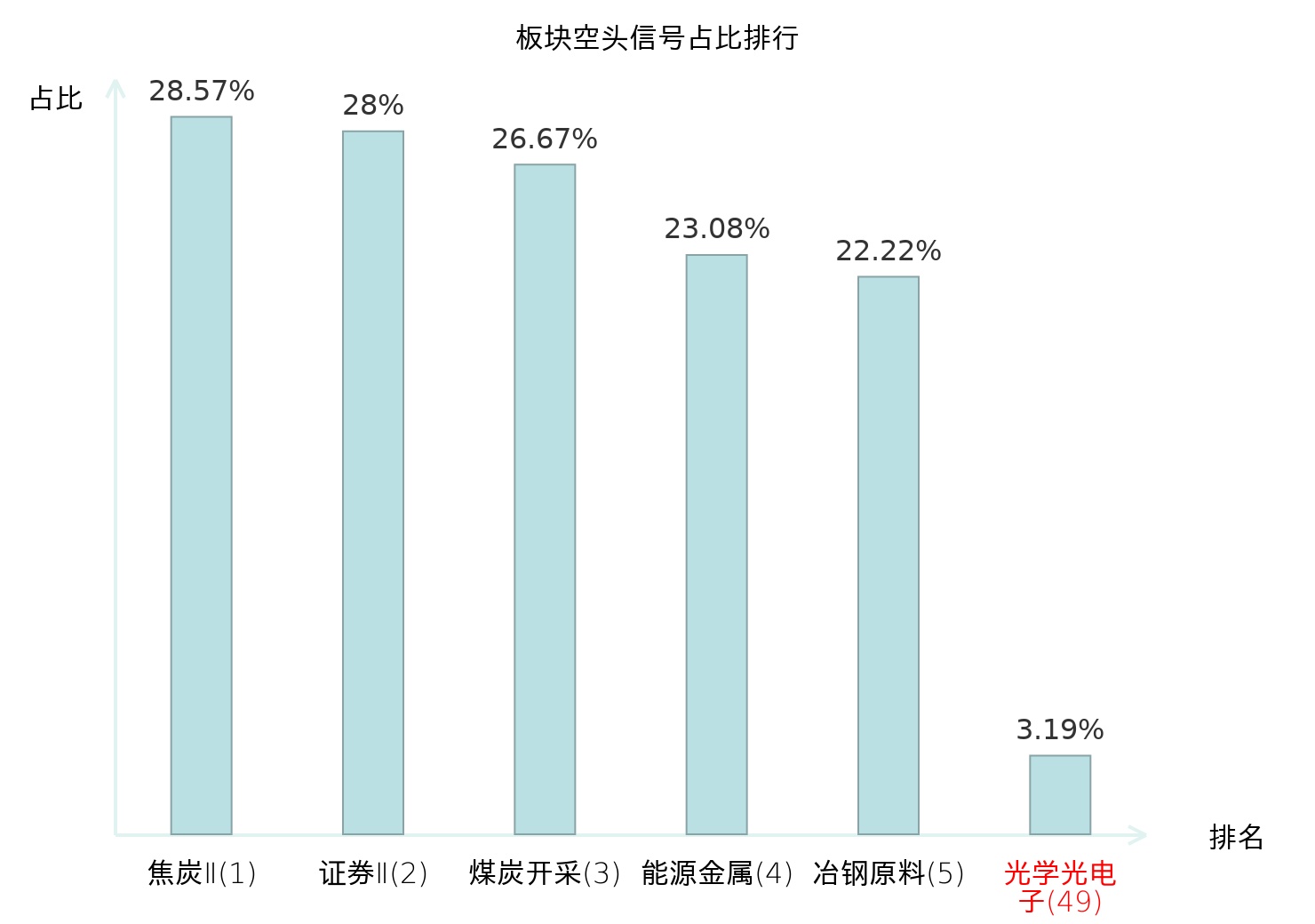 全市场所有行业板块中主力空头信号占比排名中,焦炭Ⅱ板块位居第一。煤炭开采板块名次提升最快,较昨日上升128位。