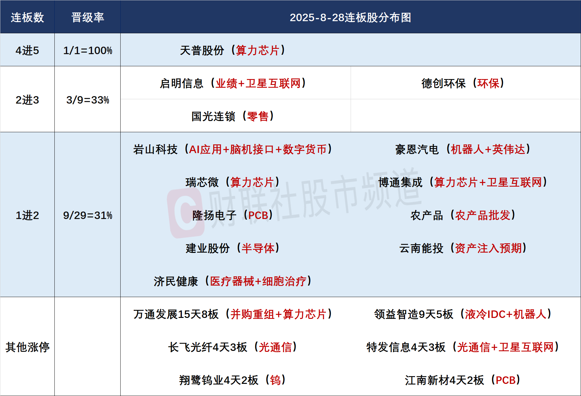 个股方面,科技大票行情延续,全市场共17只个股成交额超百亿,其中除北方稀土、东方财富、指南针外,其余均为AI产业链的科技权重,寒武纪、中芯国际、新易盛、胜宏科技均涨超15%,股价续创历史新高。连板方面,除去一字涨停晋级5连板的天普股份外,仅剩启明信息、德创环保、国光连锁3只3连板个股。