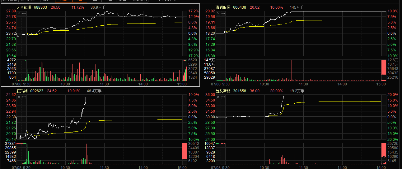 今日光伏概念股再度走强,截至收盘,核心标的通威股份涨停,大全能源涨超11%,亚玛顿上演“地天板”,次新股首航新能20CM涨停,拓日新能、亿晶光电、欧晶科技、钧达股份、凯盛新能、双良节能等多只个股涨停。