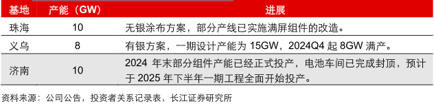 产能方面,爱旭股份布局了珠海、义乌、济南三大产能基地,截止目前已经投产的ABC电池组件产能基地规模达18GW左右。其中珠海基地部分产陑已经完成了满屏组件的改造,济南基地在2024年末投产了部分组件产能,同时电池车间已完成封顶,预计2025年下半年一期工程全面开始投产。
