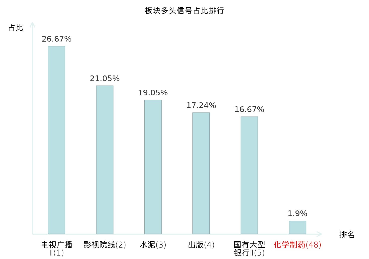 全市场所有行业板块中主力多头信号占比排名中,电视广播Ⅱ板块位居第一。国有大型银行Ⅱ板块名次提升最快,较昨日上升118位。