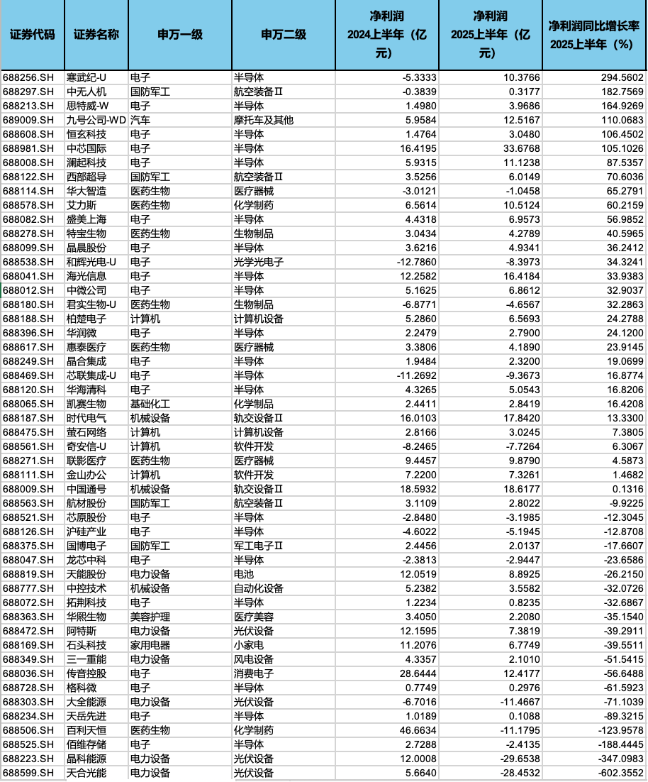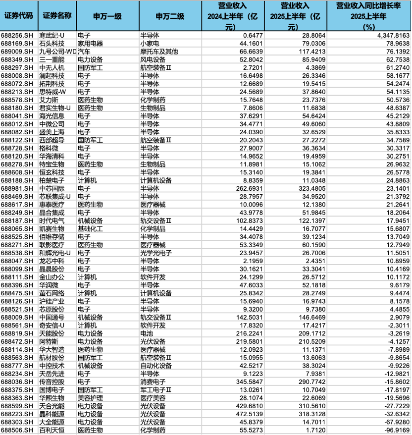 科创50成分股中,有29家于2025年上半年实现营收、净利润同比双增长,其中寒武纪、九号公司、中无人机的营收、净利润增长皆为前五。今年上半年,石头科技三一重能等营收增速超50%。