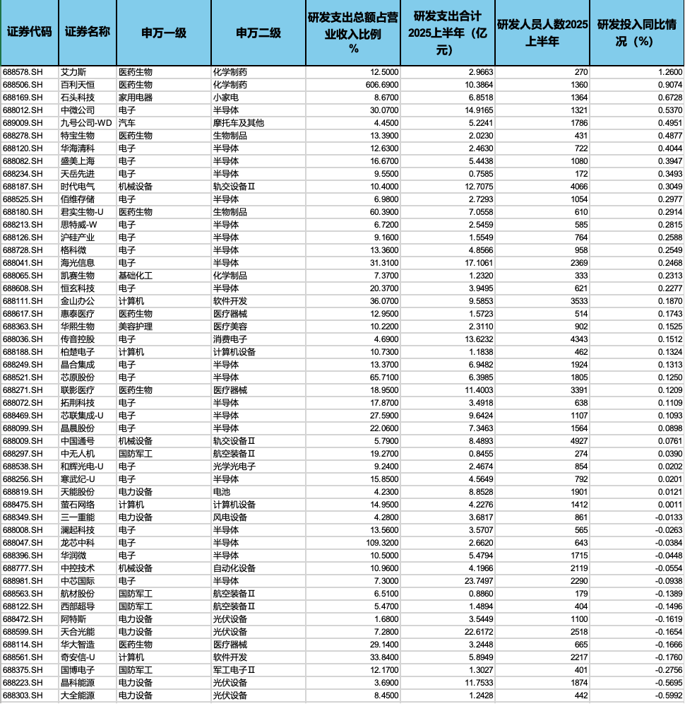 《科创板日报》记者注意到,科创50成分股公司在2025年上半年呈现出研发投入增长的发展态势。
