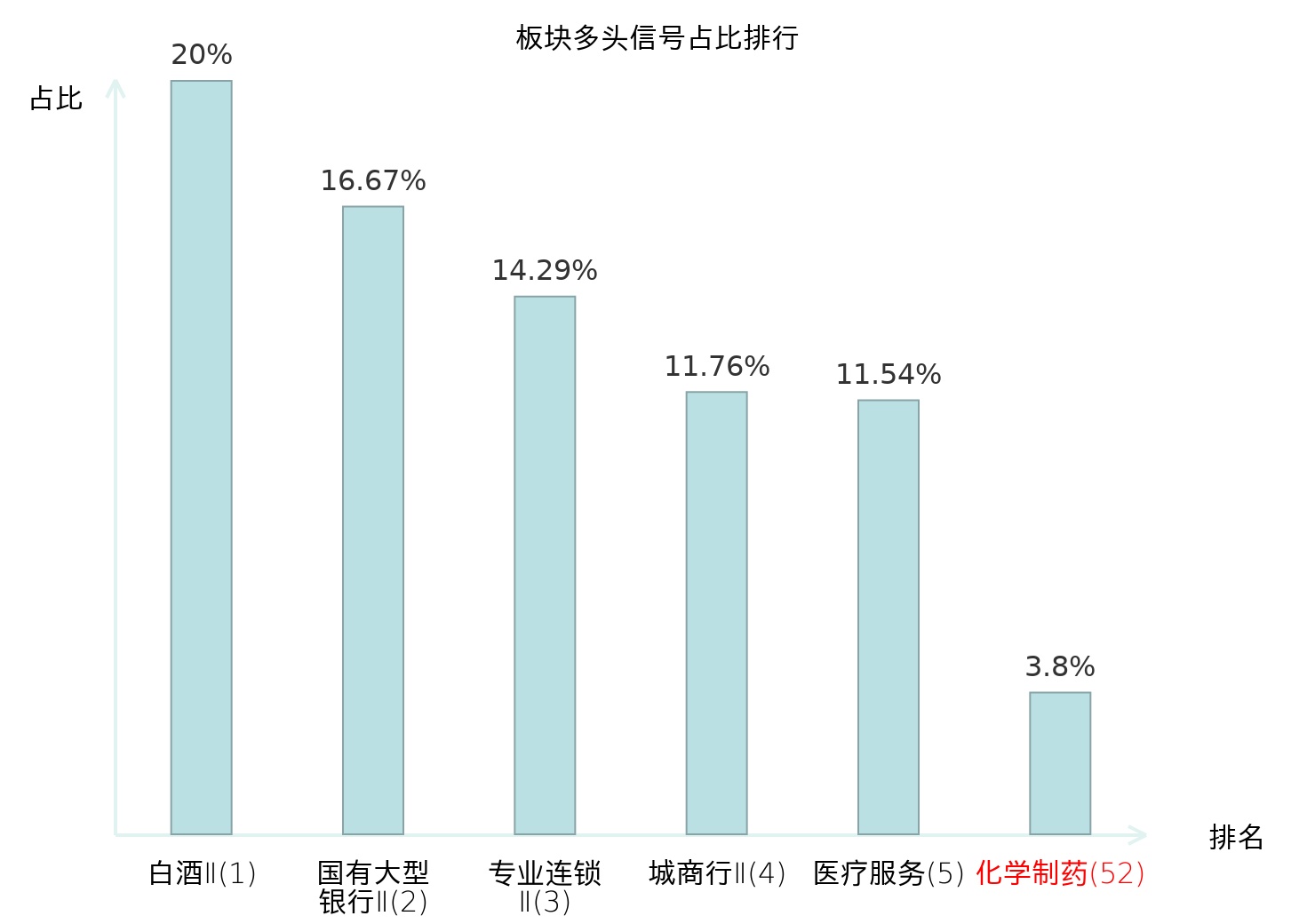 全市场所有行业板块中主力多头信号占比排名中,白酒Ⅱ板块位居第一。国有大型银行Ⅱ板块名次提升最快,较昨日上升121位。