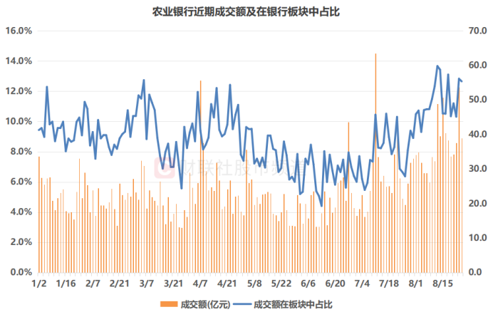 注:农业银行近期成交额及在银行板块中占比(截至8月26日收盘)
