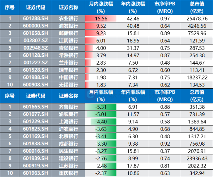 注:月内涨幅居前/靠后的银行股(截至8月26日收盘)