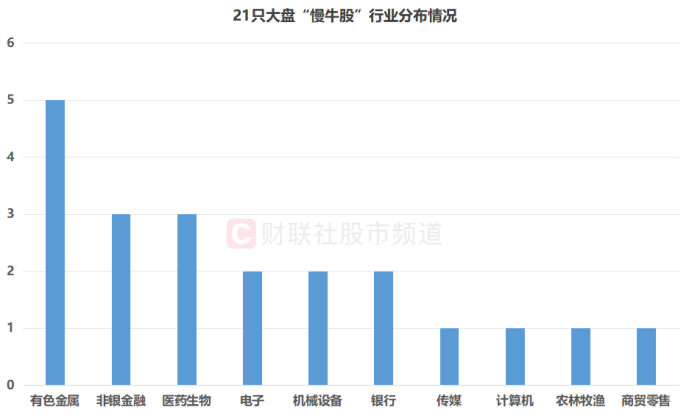 若按行业(申万一级)板块统计,21只大盘“慢牛股”中,有色金属、非银金融、医药生物股相对较多,其三者分别占比近23.8%、14.3%、14.3%,合计占比近一半,同时,其还涵盖电子、机械设备、银行、传媒、计算机、农林牧渔、商贸零售板块。从证券板块来看,其近半所属沪市主板股,深市主板、科创板各占比33.3%、9.5%,另有ST股1只。