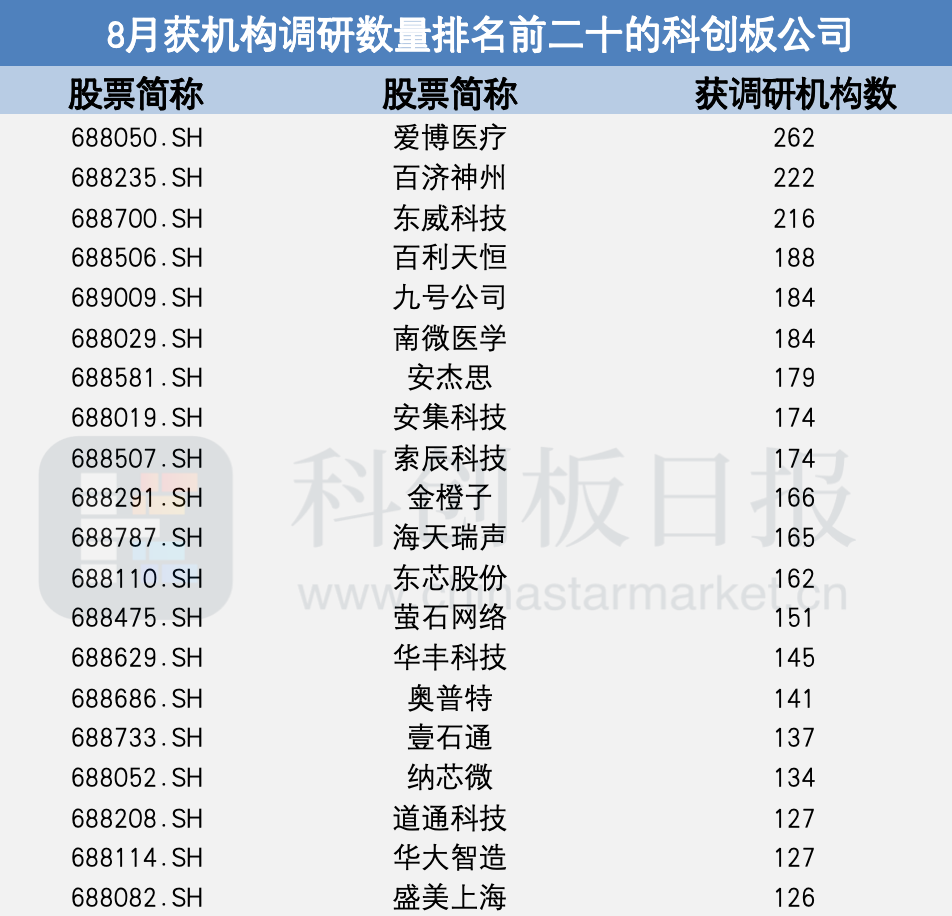 《科创板日报》9月1日讯(记者 黄修眉) 财联社星矿数据统计显示,8月1日至8月31日,总共185家科创板公司获得机构调研。
