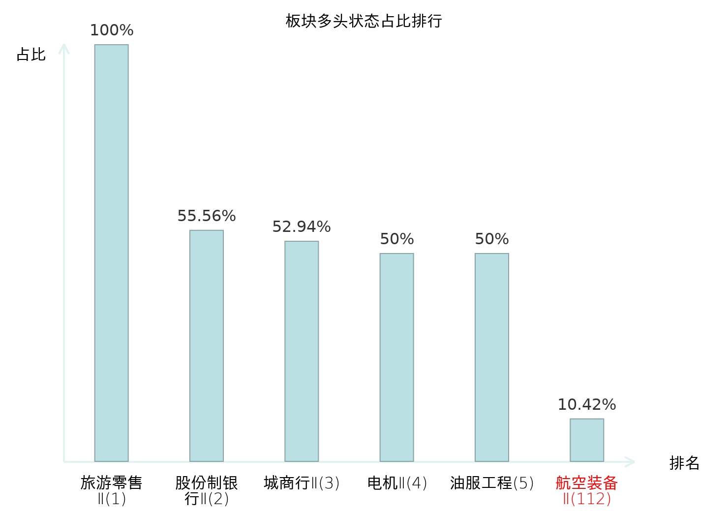 全市场所有行业板块中主力多头状态占比排名中,旅游零售Ⅱ板块位居第一。互联网电商板块名次提升最快,较昨日上升65位。
