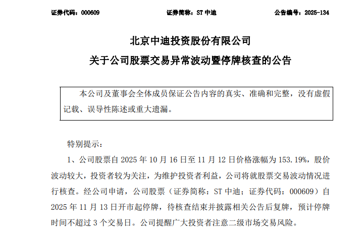 11月12日晚,ST中迪最新公告,公司股票自2025年10月16日至11月12日价格涨幅为153.19%,股价波动较大,投资者较为关注,为维护投资者利益,公司将就股票交易波动情况进行核查。公司股票自2025年11月13日开市起停牌,待核查结束并披露相关公告后复牌,预计停牌时间不超过3个交易日,请广大投资者注意二级市场交易风险。