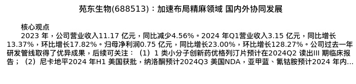 值得注意的是:2024年04月中信建投证券的贺菊颖/袁清慧分析师,首次发布关于苑东生物的研究报告,标题为:苑东生物(688513):加速布局精麻领域 国内外协同发展。