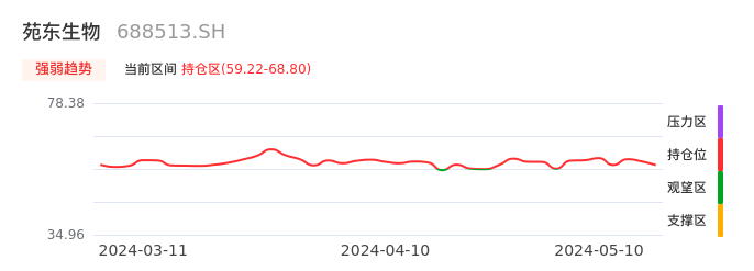 我们来看一下该股的九方特色指标强弱趋势的情况:苑东生物自04月22日从观望区上穿到持仓区。股价近期在多头区域回调整理。后续重点关注多空分界点的争夺:59.22元。如未能有效站稳则可能重新回到空头行情。