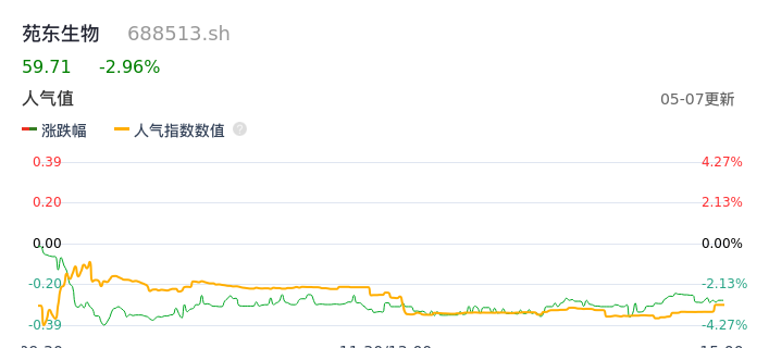 05月07日,苑东生物收报59.71,股价涨幅-2.96%,成交金额5897.18万元,换手率0.82%。