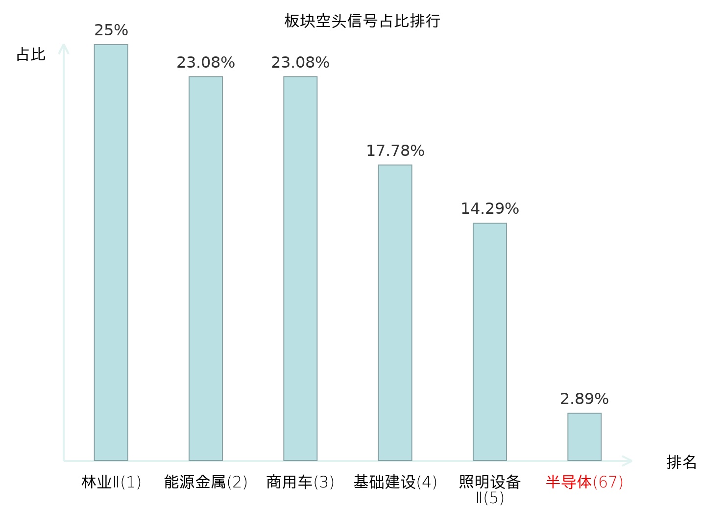 全市场所有行业板块中主力空头信号占比排名中,林业Ⅱ板块位居第一。油服工程板块名次提升最快,较昨日上升93位。