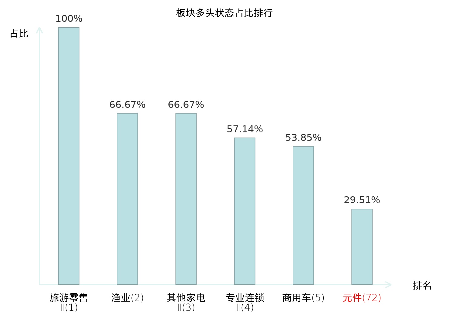 全市场所有行业板块中主力多头状态占比排名中,旅游零售Ⅱ板块位居第一。农产品加工板块名次提升最快,较昨日上升46位。