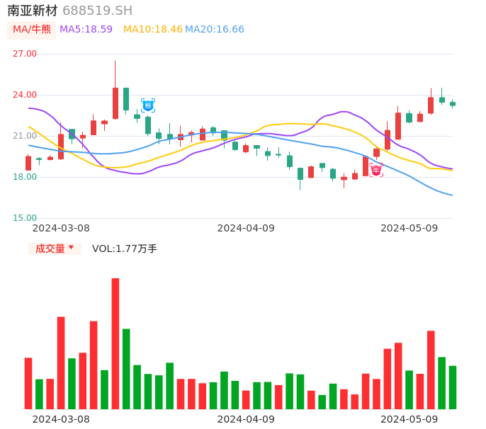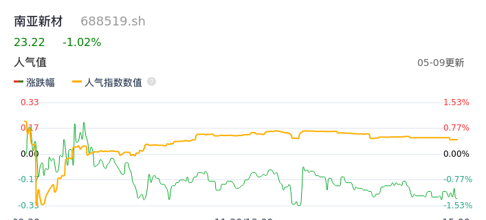 05月09日,南亚新材收报23.22,股价涨幅-1.02%,成交金额4118.00万元,换手率0.75%。