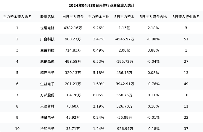 从主力资金流向来看,元件行业今日主力资金流入35.17亿元,在所有申万二级行业中排名:101/131。