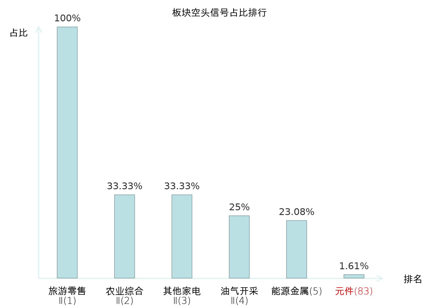 全市场所有行业板块中主力空头信号占比排名中,旅游零售Ⅱ板块位居第一。影视院线板块名次提升最快,较昨日上升105位。