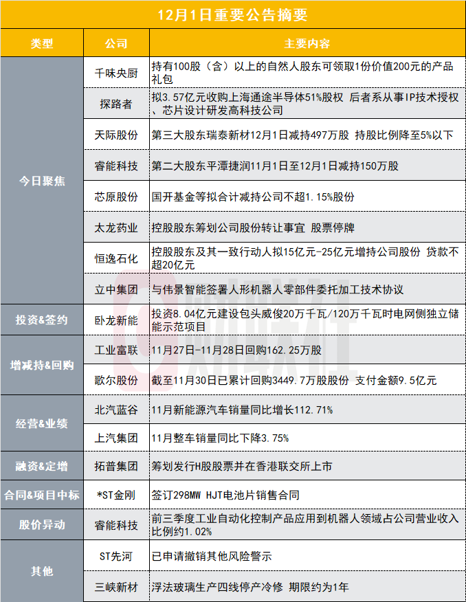 睿能科技(603933.SH)公告称,公司股票交易于2025年11月26日至28日连续三个交易日内日收盘价格涨幅偏离值累计达到20%,12月1日再次涨停。公司澄清,其工业自动化控制产品主要应用于纺织、机床加工等领域,2025年前三季度应用到机器人领域的营业收入金额约1,678万元,占公司营业收入比例约1.02%,后续业绩增长存在较大不确定性,对公司业绩无重大影响。此外,公司股东平潭捷润已通过集中竞价方式减持公司1,50万股,仍处于减持计划期间。