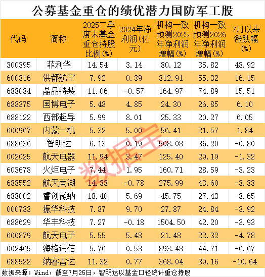 结合公募基金重仓持股以及业绩增长潜力两个维度来看,上述22只个股中,机构一致预测2025年、2026年净利润增幅超过20%的有16只,其中有9只个股获机构一致预测2025年净利润增幅超过100%,包括智明达、纳睿雷达、洪都航空等。以纳睿雷达为例,公司获公募基金重仓持股的比例超过11%,机构一致预测公司2025年净利润增幅有望超过350%,2026年有望超过35%。公司2025年上半年净利润大幅增长,西部证券表示,公司水利气象雷达业务稳增,新签订单饱满。