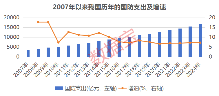 2025年国防科技工业新闻宣传与军工文化建设领导小组会议指出,2025年是决胜“十四五”、谋划“十五五”的关键之年,是国防科技工业高质量发展之年。国家统计局数据显示,我国国防支出逐年增加。2024年,中央本级支出中,国防支出16652.08亿元,完成预算的100%。根据此前公布的2025年中央和地方财政预算草案报告,2025年国防支出为17846.65亿元,将连续3年保持7.2%的年增长率。